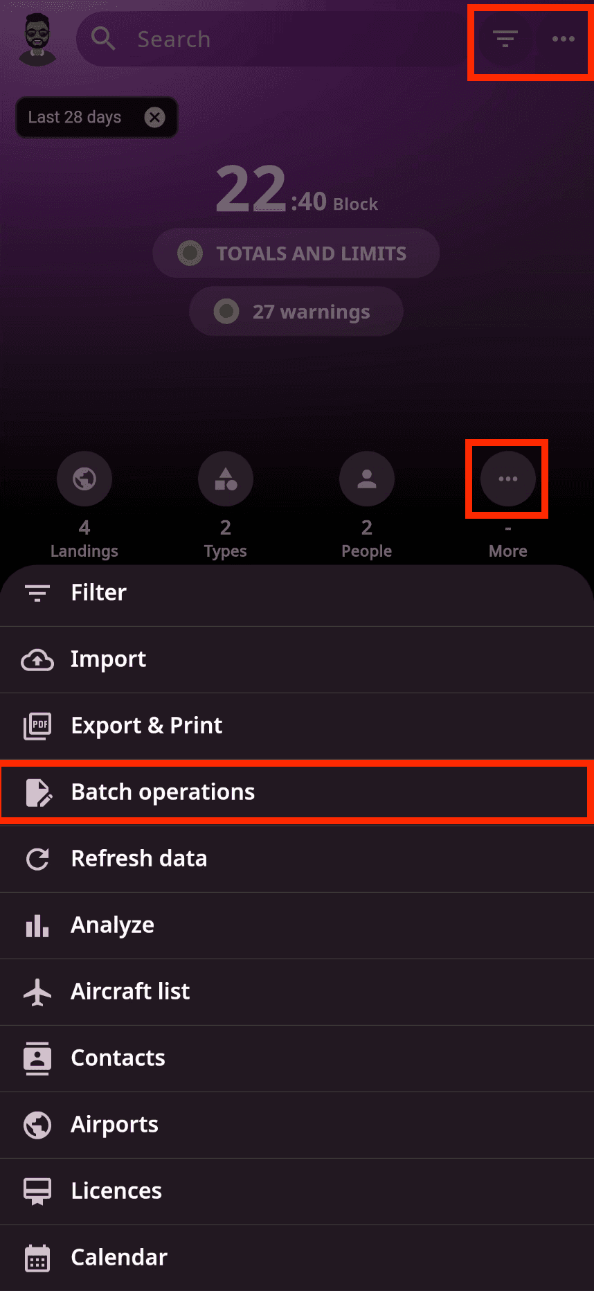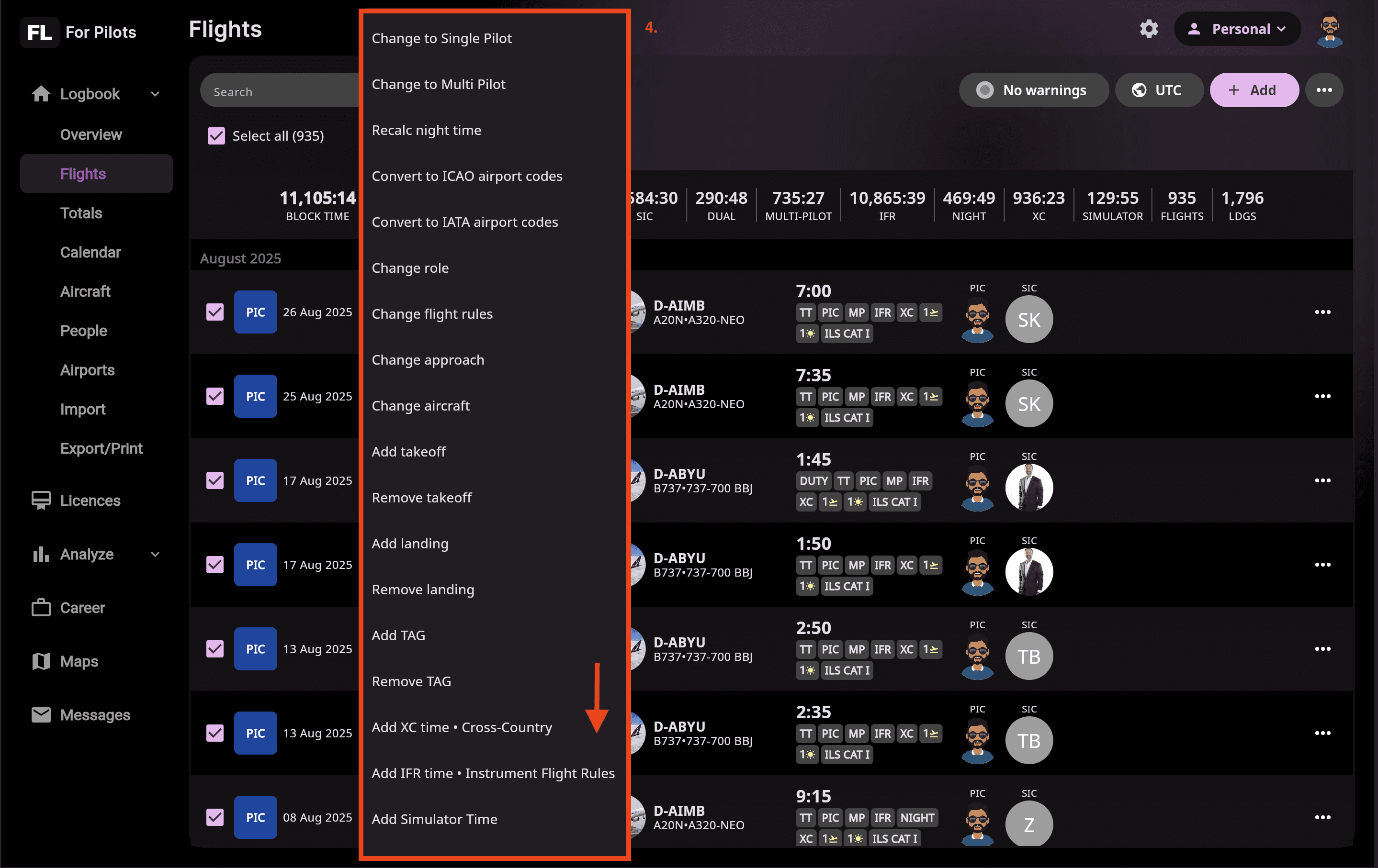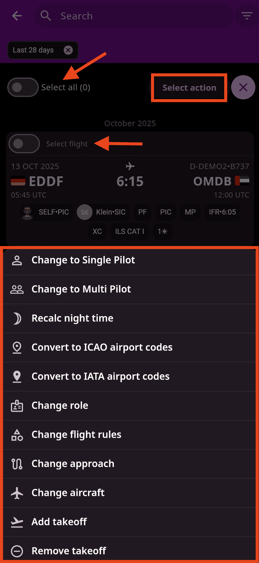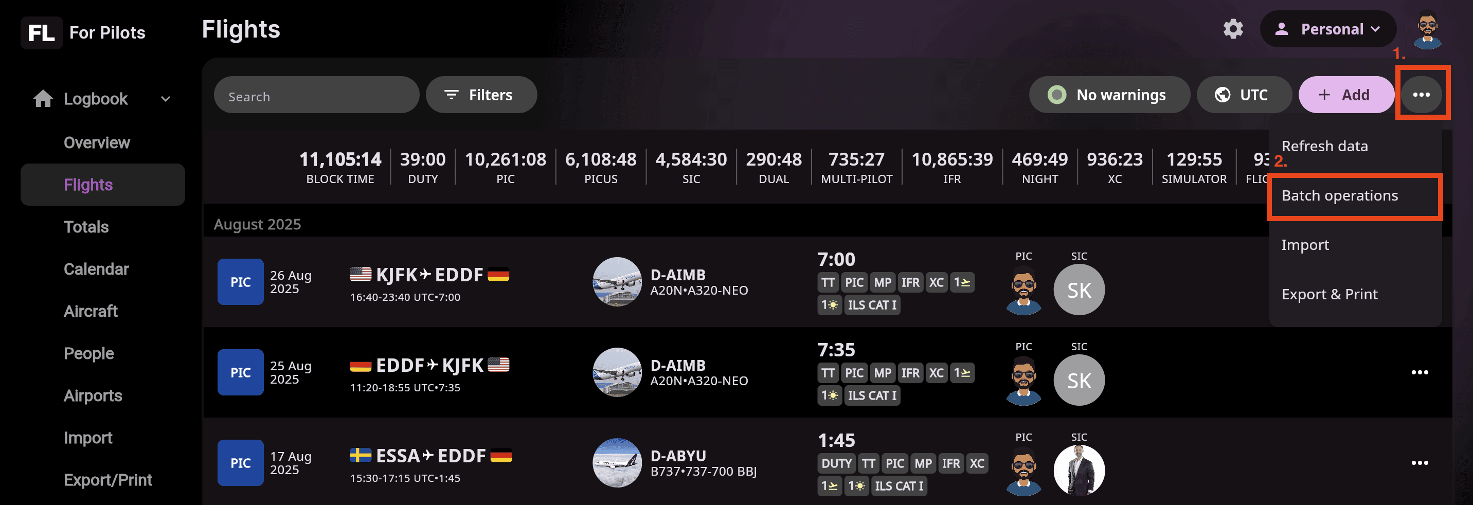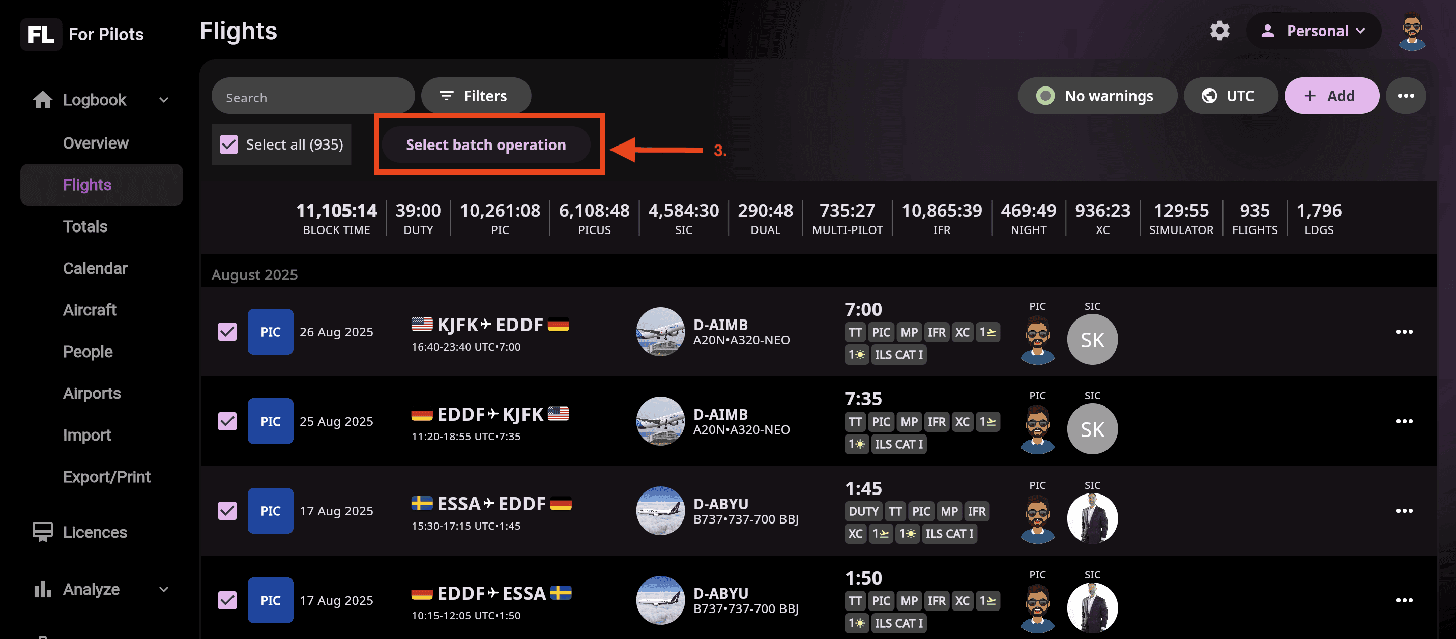 💡 Tip: Use filters to quickly target a specific date range, aircraft, or flight type before applying a batch action — this helps ensure only the intended entries are modified.