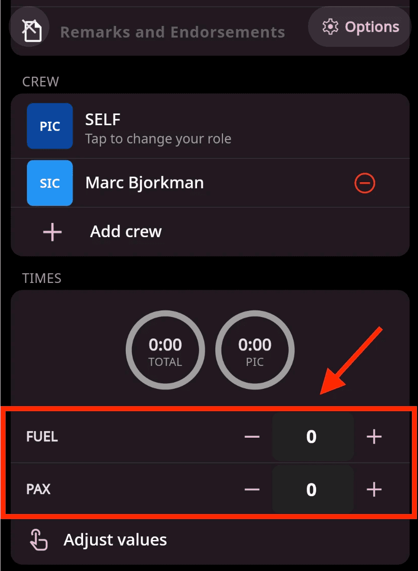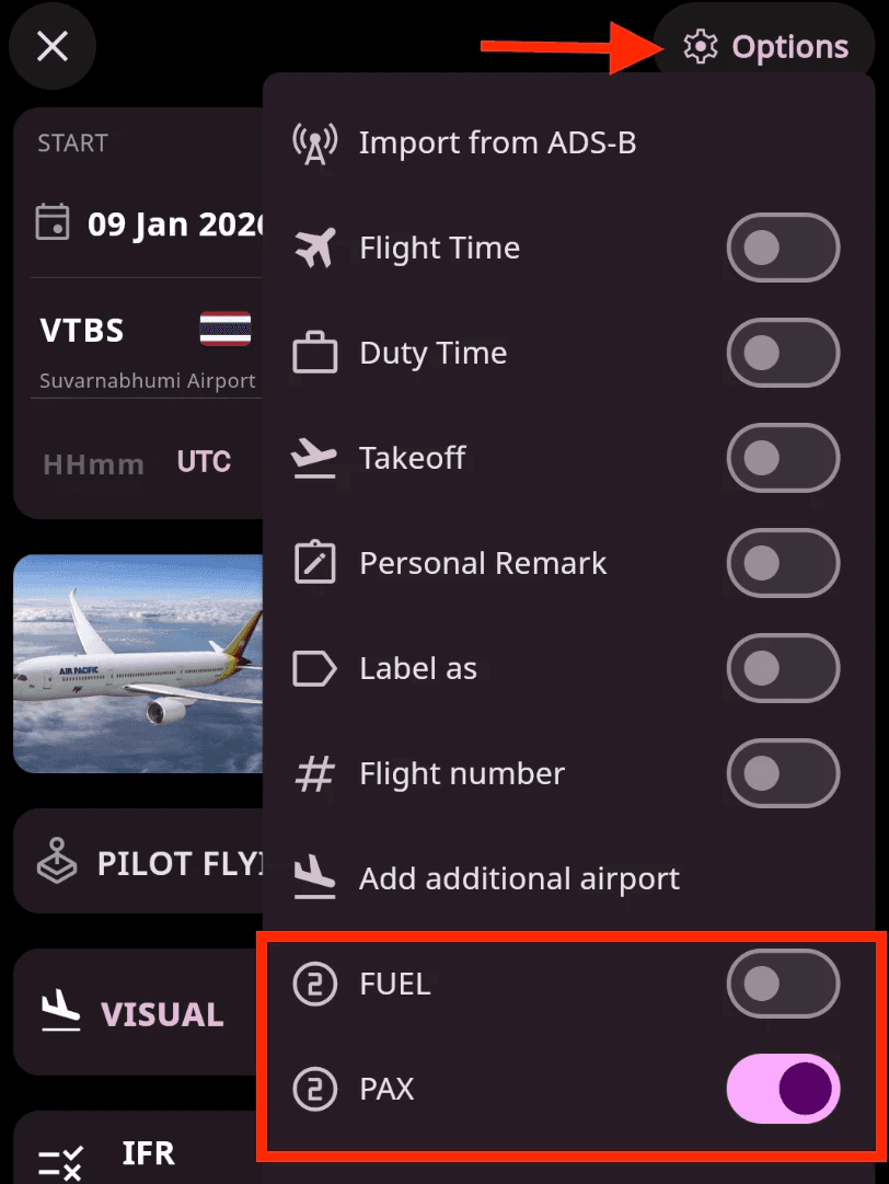 Enable fields for logging: Custom fields appear in the Options section of the manual flight form. Enable or disable them based on your current logging needs.