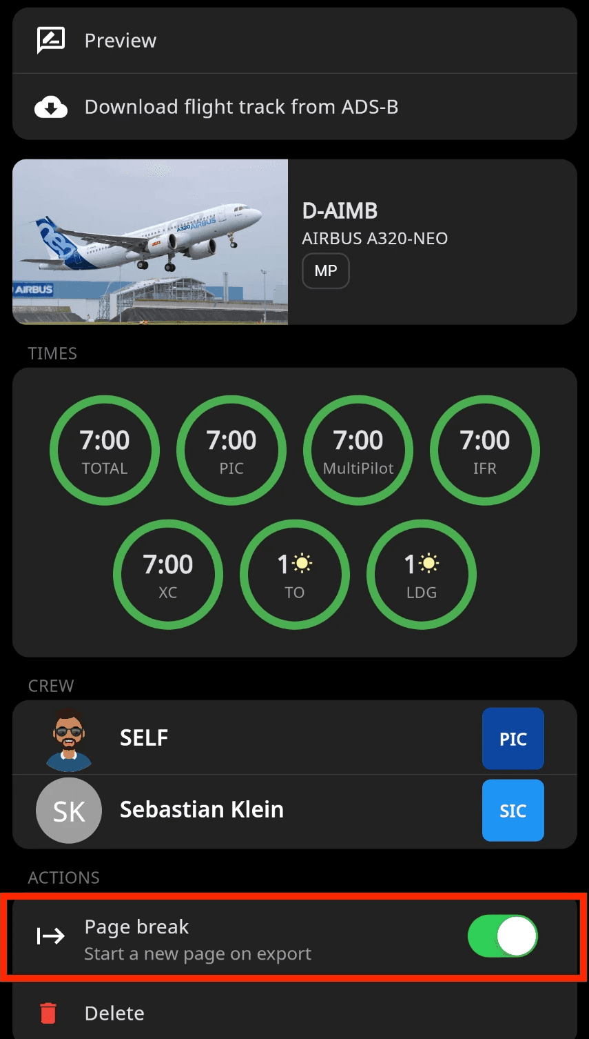 Page break allows you to manually insert a new page within a document, ensuring that content after the break starts on a fresh page when exported. This is useful for organizing logbook exports, separating sections, or matching digital layouts to physical printouts.