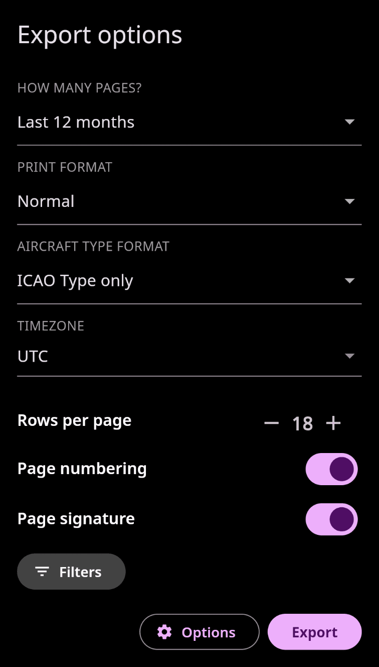 Advanced customization options allow users to configure log exports by enabling/disabling page numbering, specifying the time zone, disabling signature and selecting aircraft type format.