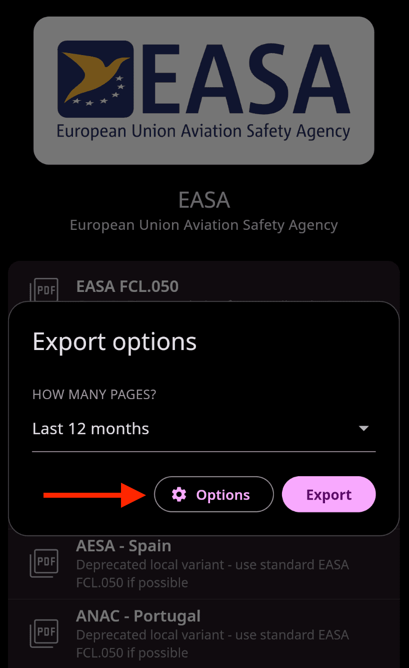 Choose your aviation authority, select the desired format, and customise the report using the available advanced options (see details below).