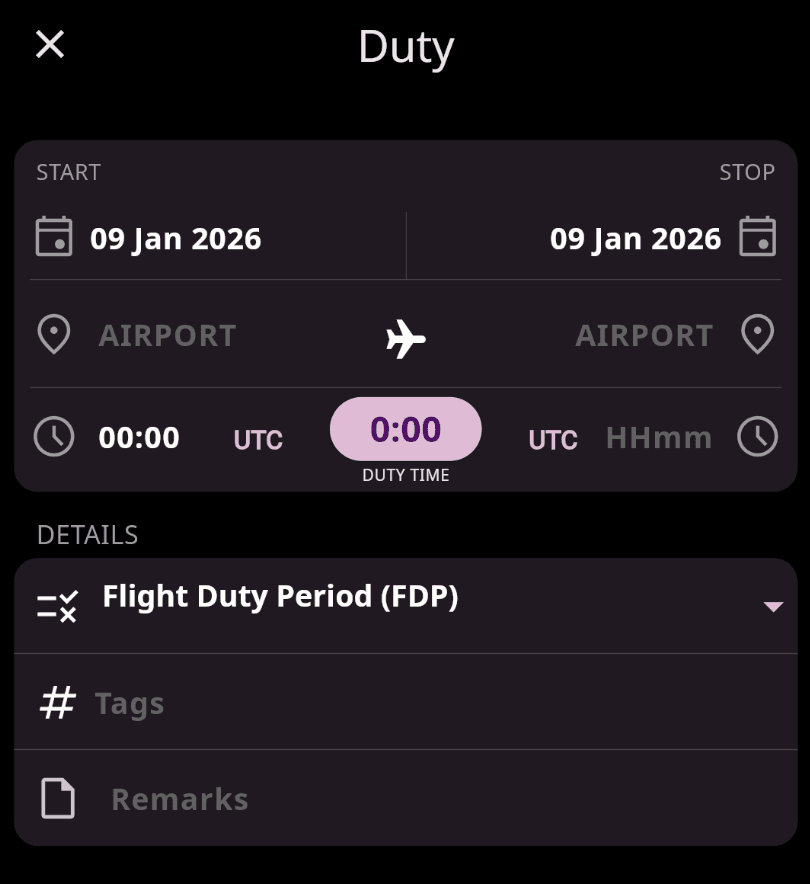 Mobile app: Tap the + button on the main screen in the mobile app. Web app: Go to Flights, click the + button, select Duty. -> Fill in the form.