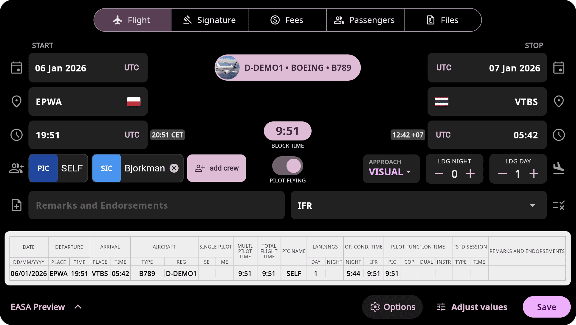 Logging your flights manually is fast and intuitive, thanks to a flexible and easy-to-use logging form with multiple options to customize it according to your flight operations.