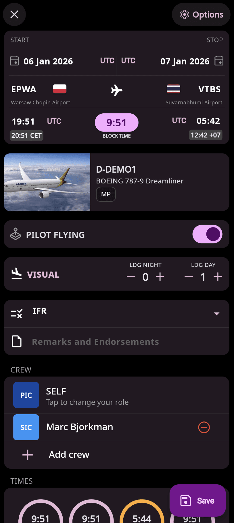 Your most recent departure, arrival, and aircraft are pre-filled automatically for quick entry.